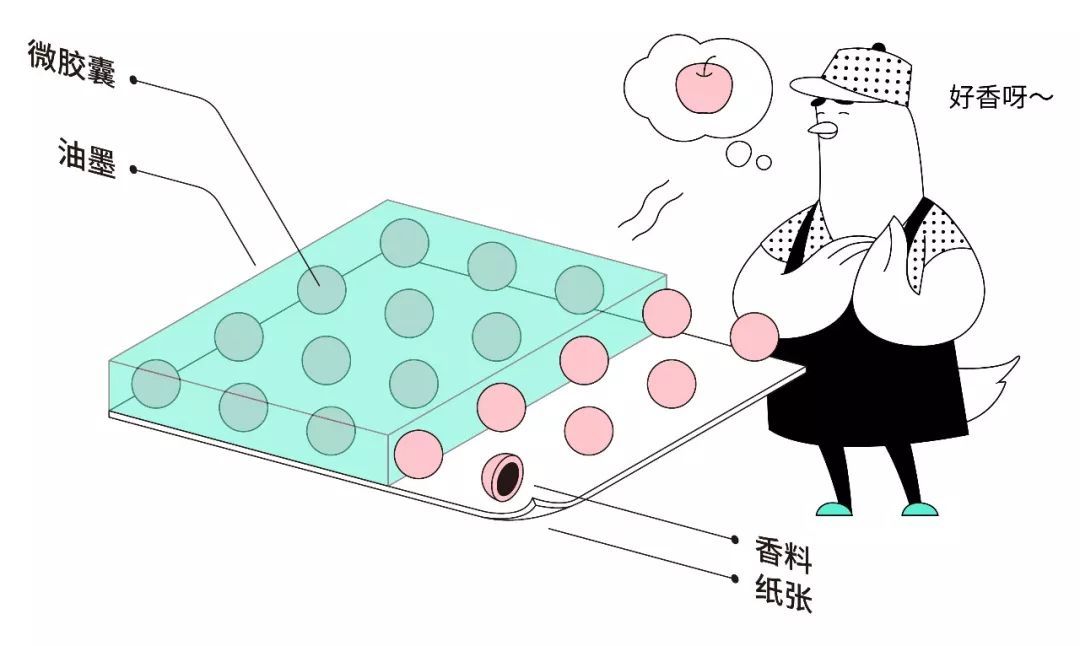 將內涵香料的微膠囊混入油墨印刷的方式,香味除了果香、花香、食物香氣等等還可以指定特殊氣味。可以選擇香氣鮮明持久的絲網印刷或節省成本的平板印刷。用的時候記得確保印刷面積足夠,并且考量香味和印紋的加成效果。