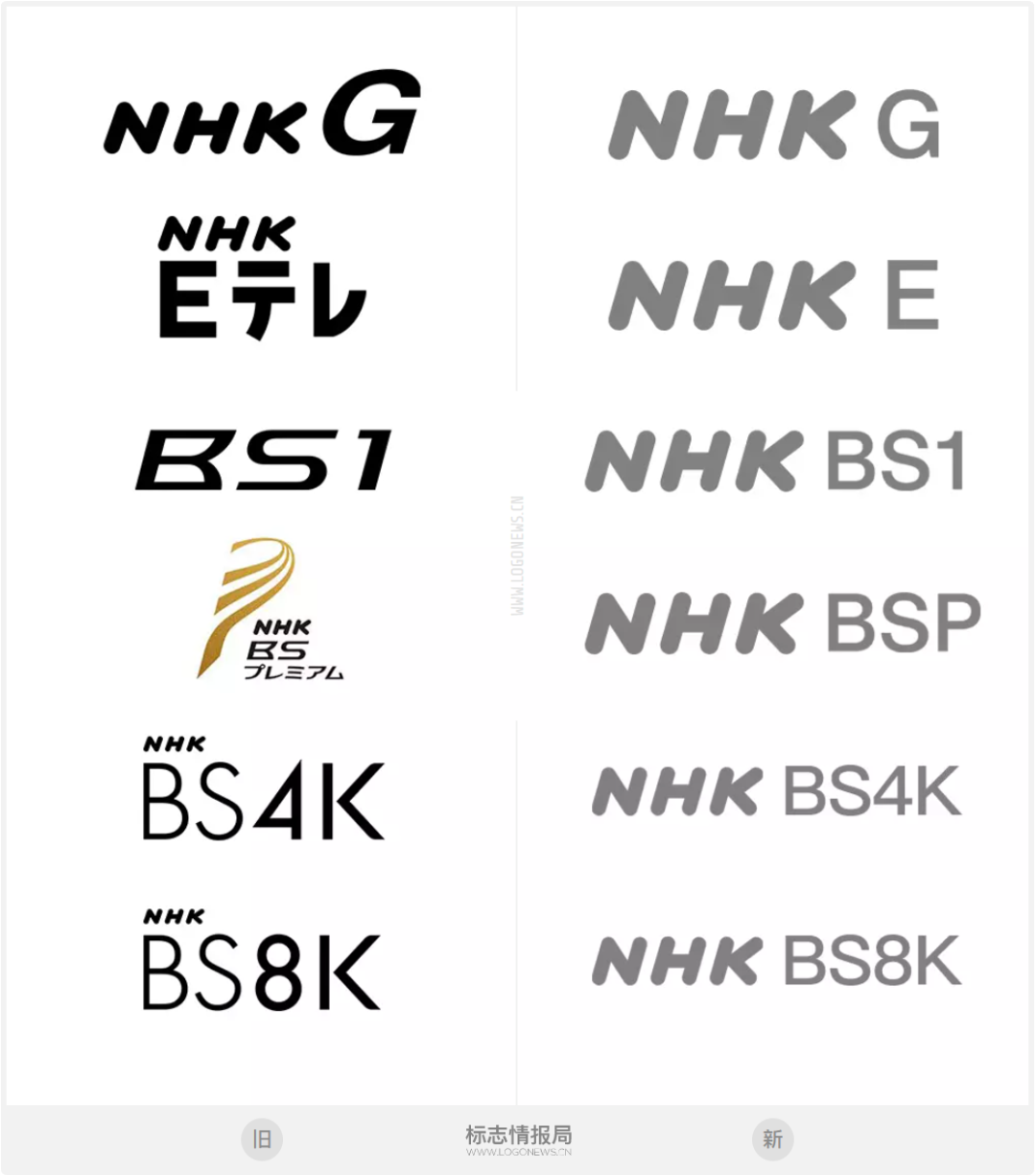 為了更直觀對(duì)比,我們找到了新舊高清版LOGO,可以看出所有臺(tái)標(biāo)統(tǒng)一為新版「NHK」字標(biāo),后面的頻道名稱則使用常規(guī)的無(wú)襯線文字。